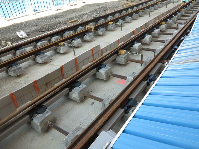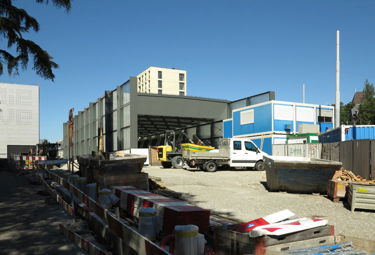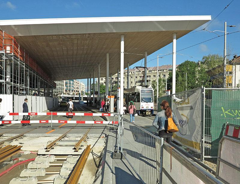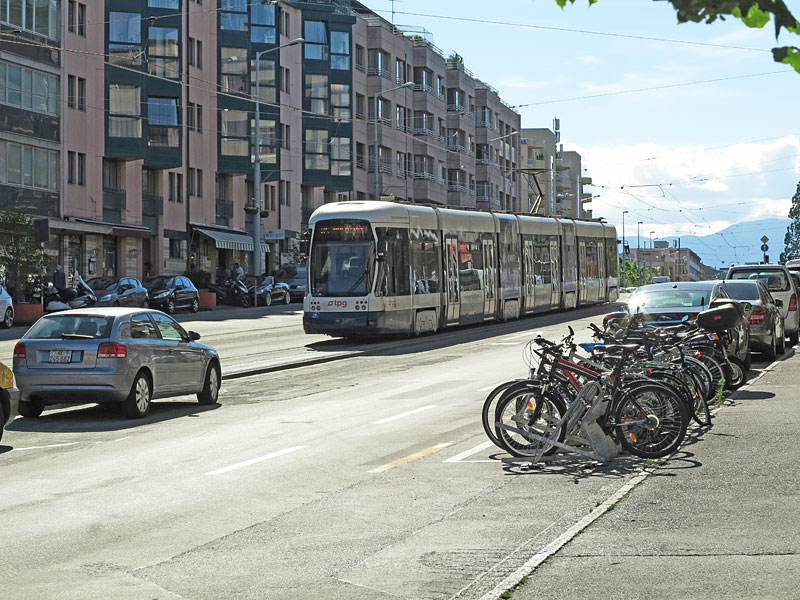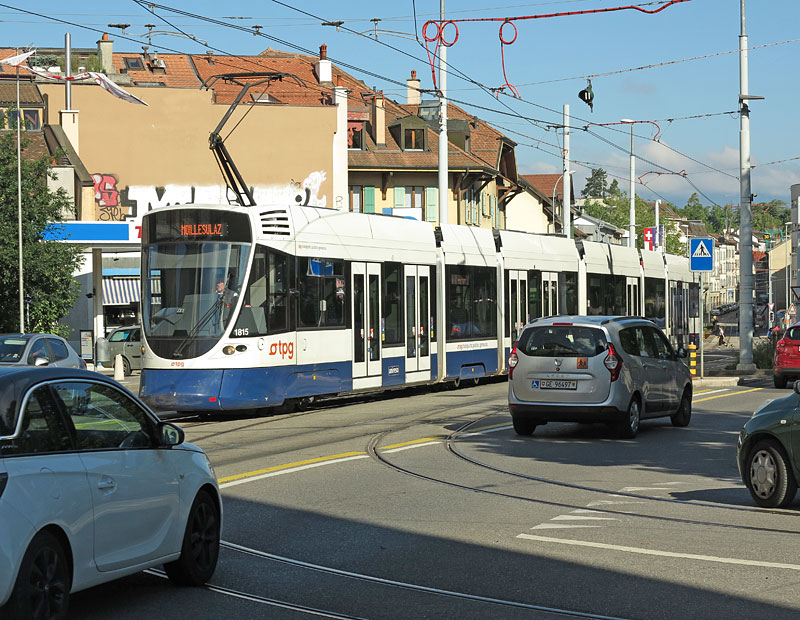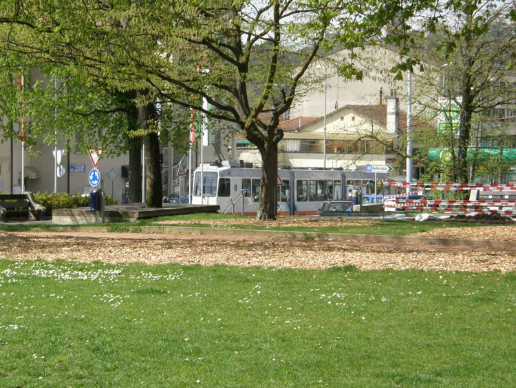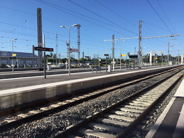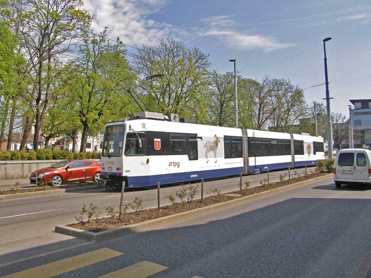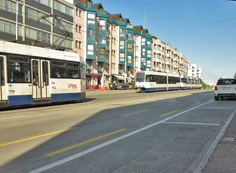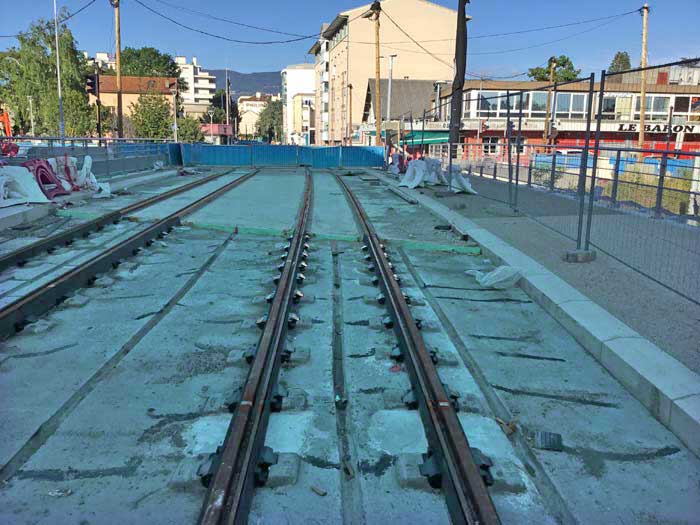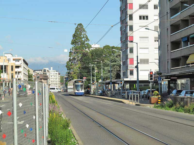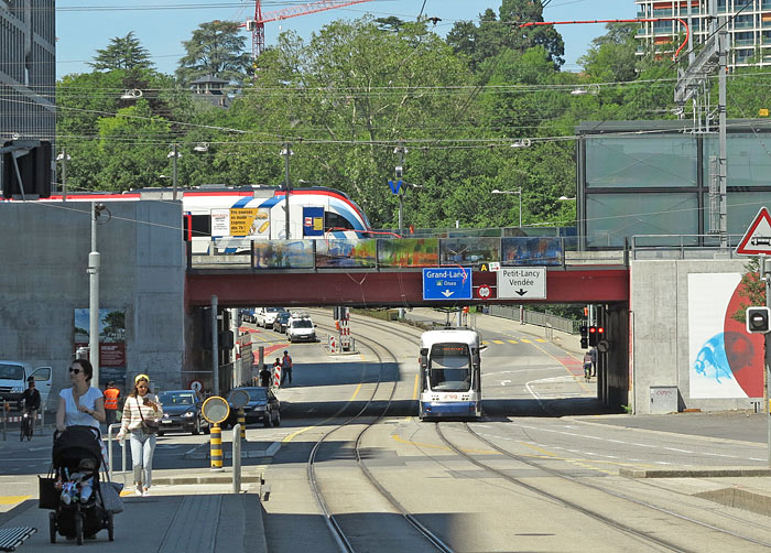 新駅ランシーボンルージュ駅付近、レマンエクスプレス新造車輌と路面電車