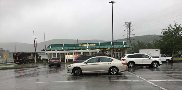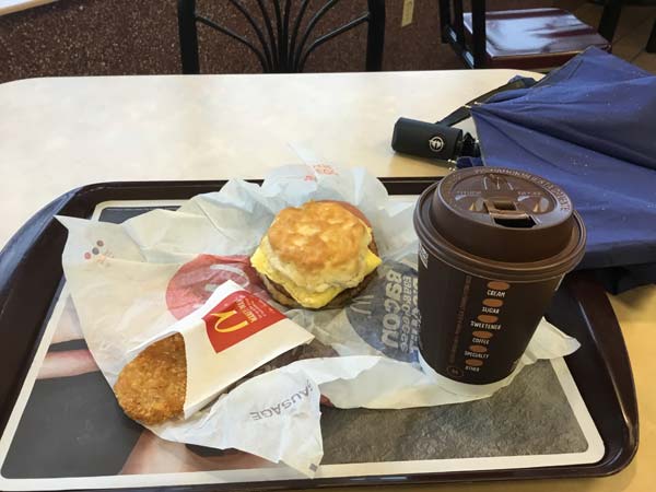 ニューアーク手前 60 Km 程のレストエリアで朝食。雨も激しいし、車も多い。
